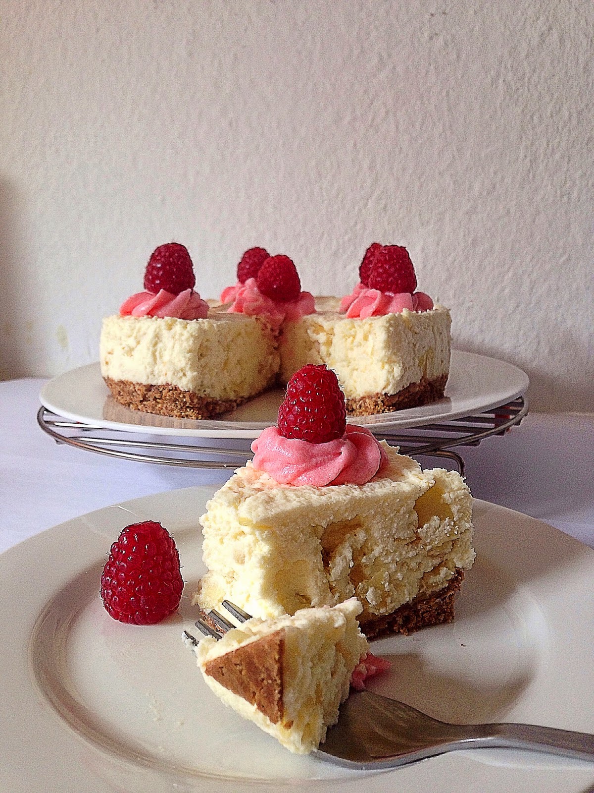 The sweetness of the white chocolate cake goes perfectly with the almonds inside (I added soo much almonds because I love them!) and the addition of the pink confectioners' frosting complement the fresh raspberries on top. Also a bit crunchiness from the base is one important element for the flavour of the cake as whole.